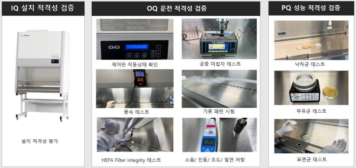 ■ 실험실에서 사용되는 생물안전작업대 및 클린벤치 등과 같은 위해 물질을 취급하는 장비는 국제 규격 또는 단체가 정하는 기준에 의해 제작돼야 합니다. 그 기준과 규격에 적합한지 확인하는 절차를 밸리데이션이라 하며, 자격을 취득한 전문가에 의해 공정하고 신뢰가 바탕이 된 장비로 검증돼야 합니다.